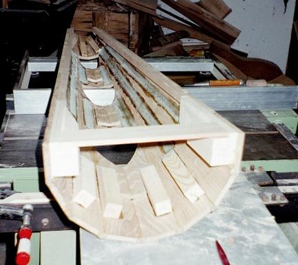 Unten siehst Du links den Klangkörper (samt Klangdecke) der "Troubadour", rechts den frisch verleimten Klangkörper einer "Teitru"-Harfe, die ich 2001 im Baukurs gebaut habe.