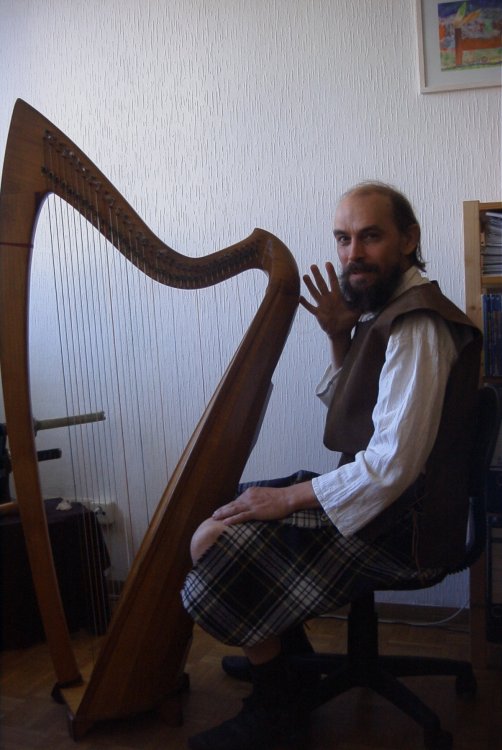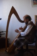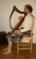 - setz Dich auf einen bequemen Stuhl, so daß Deine Schulter etwas tiefer als das Knie der Harfe ist