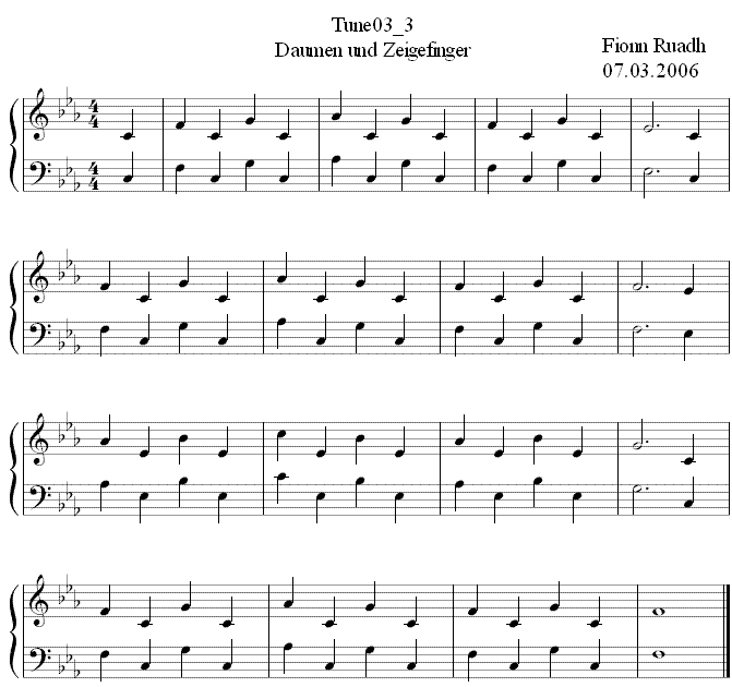 Zeigefinger spielt jeweils den "Orgelpunkt", nämlich in den Zeilen 1, 2 und 4 das "C", in der dritten Zeile das "Es". Der Daumen