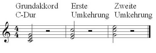 Was aber sind Umkehrungen? Ganz einfach: Akkorde, die _nicht_ auf dem Grundton, der Tonika, basieren! Nehmen wir den C-Dur-Akkord von oben: in der Reihenfolge "tiefer Ton -> hoher Ton" notiert sieht er so aus: C - E - G. Wir wir aus der Theorie wissen, bedeuten Töne, die im Oktavabstand stehen, den gleichen Ton. Wir können also das tiefe "C" aus dem Akkord herausnehmen und oben wieder draufpacken. Das ergibt dann die Folge E - G - C. Fertig ist die Erste Umkehrung. Das Spiel können wir weiter treiben und erhalten die Zweite Umkehrung. Wie sie notiert ist? Denk' es Dir selber aus! Und wenn Du mit der Maus ein wenig über diesem Text verweilst, siehst Du die Auflösung ...